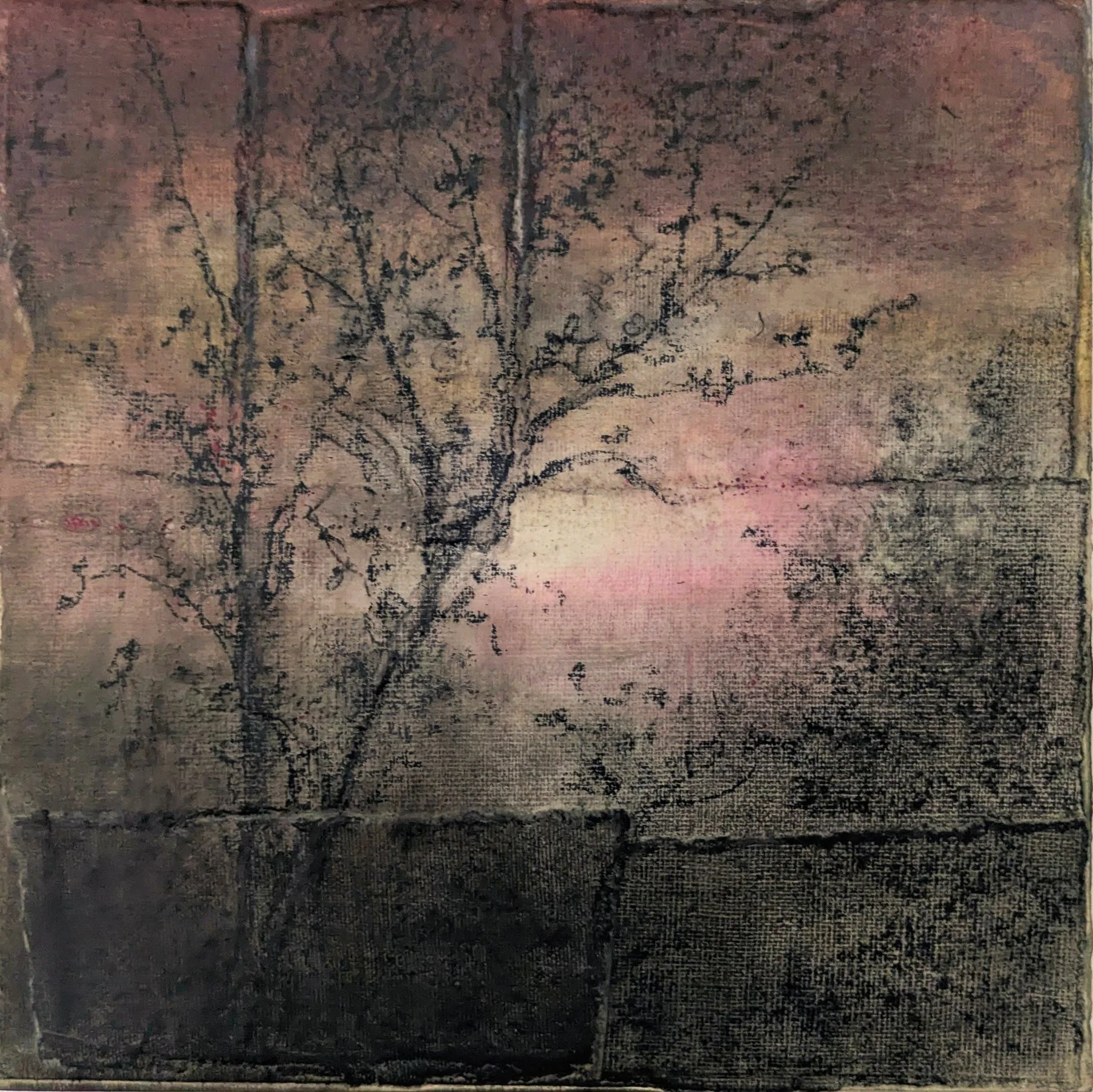 Charcoal, pastel and acrylic on collaged paper on wood; 20 x 20 cm
